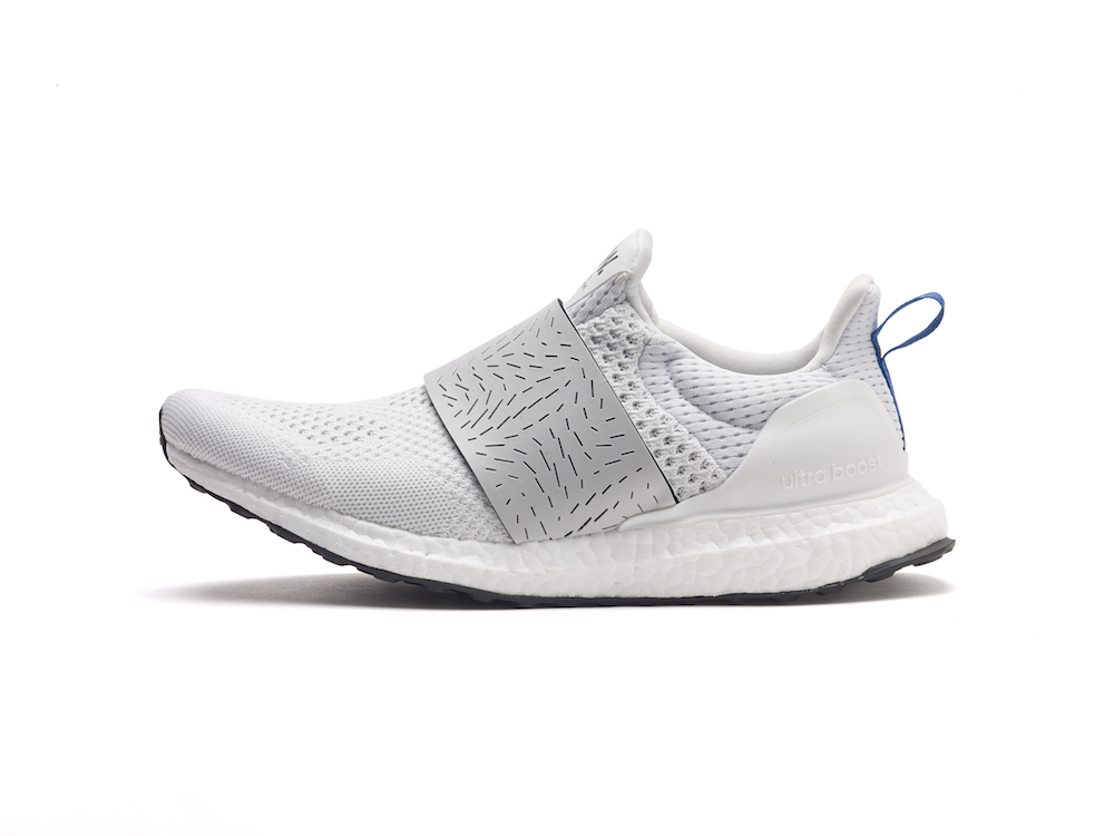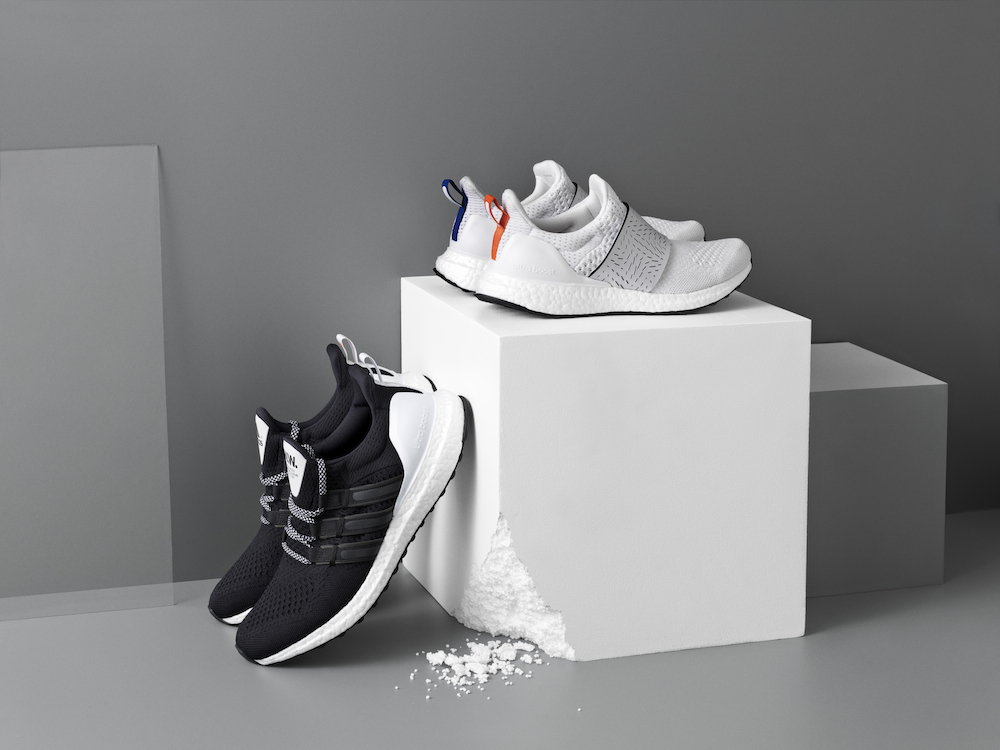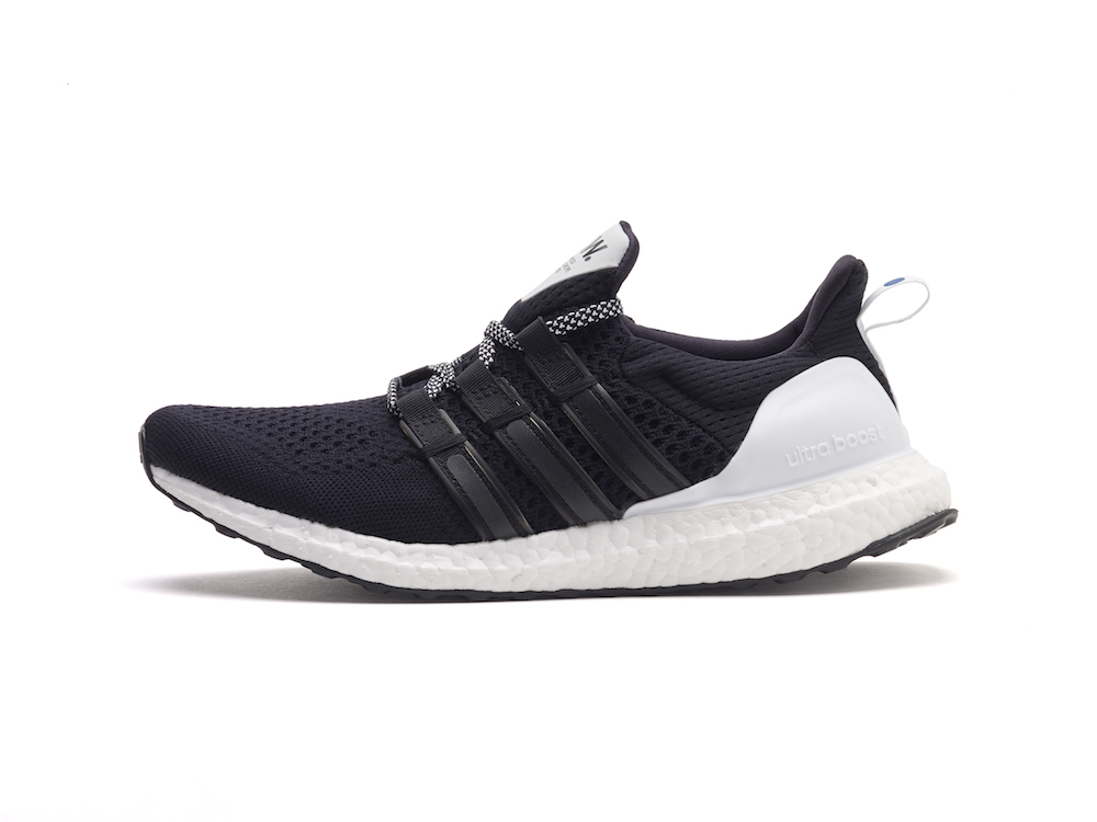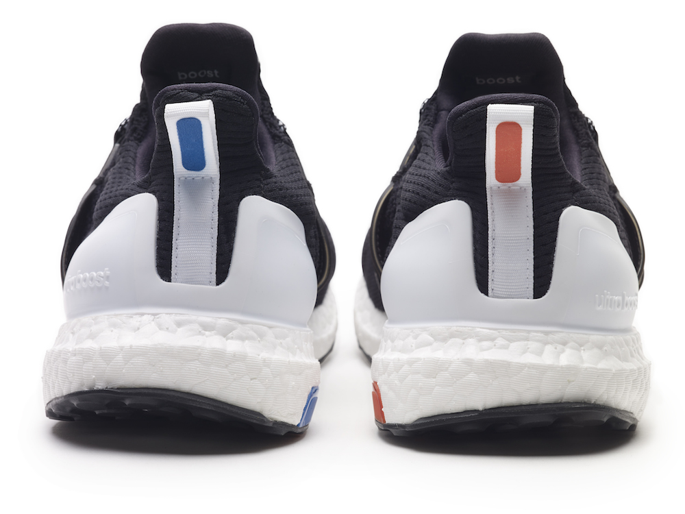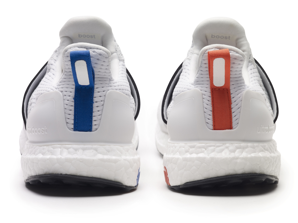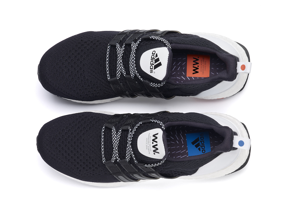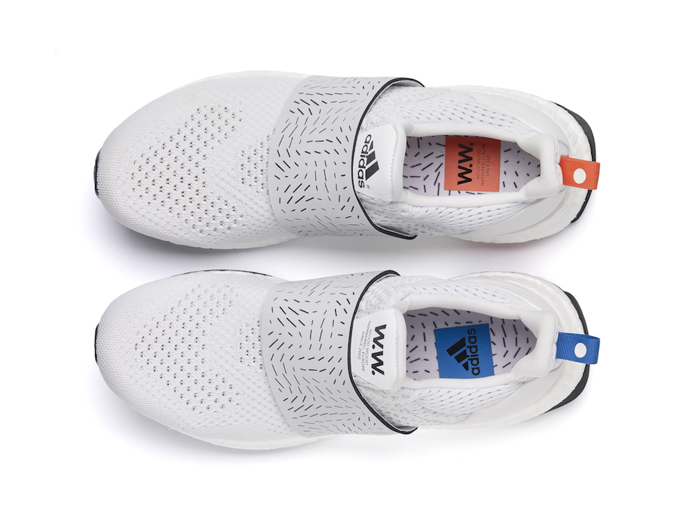C’est modèle sont teintés d’astrophysique et des ondes gravitationnelles oranges et bleues si chères à Albert Einstein. Wood Wood a incorporé ces éléments pour développer l’esthétique de leurs UltraBOOSTs. Le bleu et le orange se succèdent sur chacun des modèles – sur des zones de la semelle, la languette du talon et les paires de lacets supplémentaires pour la version noire masculine. Pour la version féminine, Wood Wood a modifié le système de laçage pour créer une bande élastique et donner un style slip-on à la chaussure.
