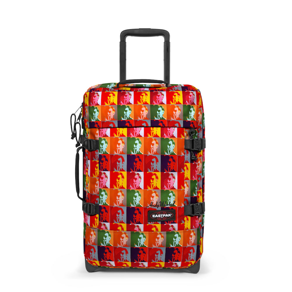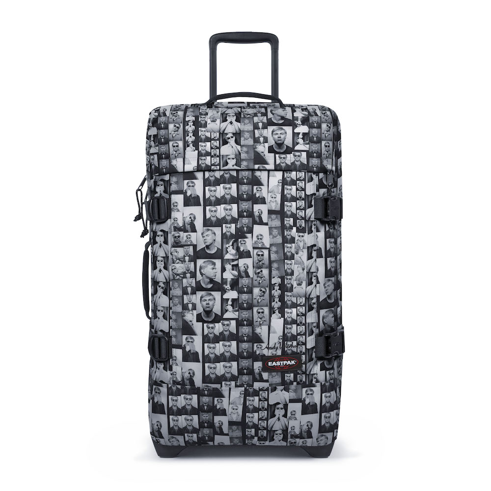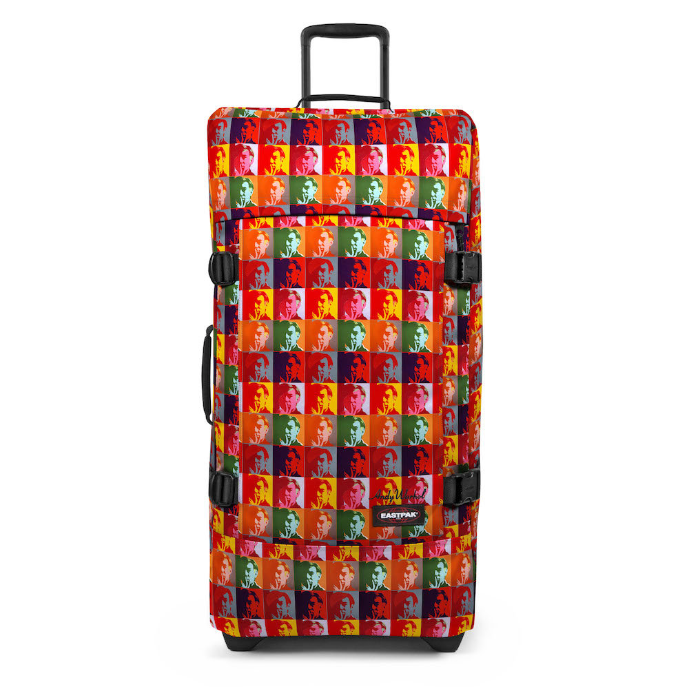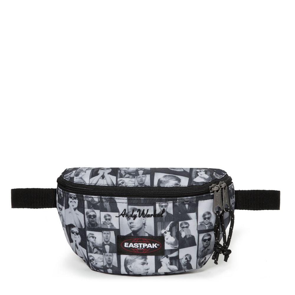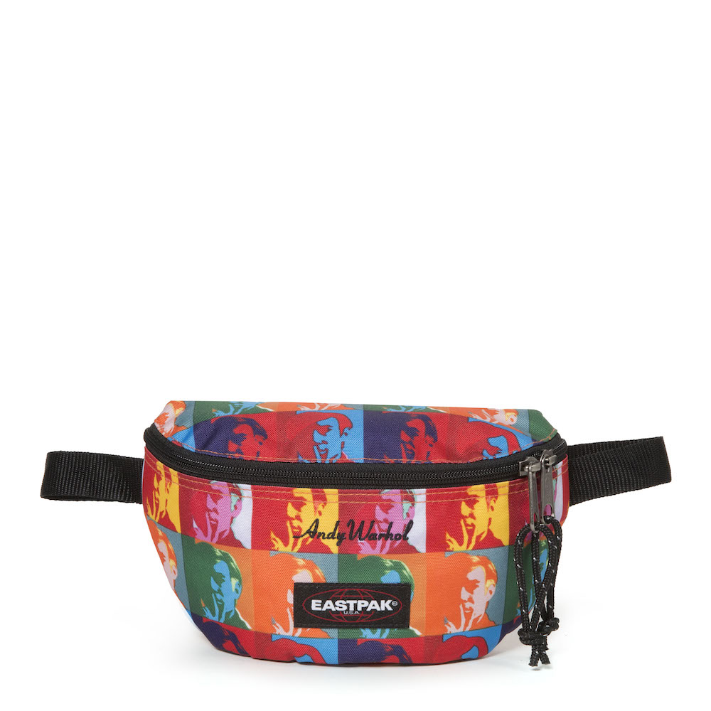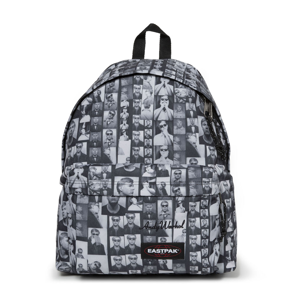 Warhol a souvent été photographié portant le Padded Pak’r. Ce sac Eastpak, son préféré, ici en cuir noir, est revisité à son image et au travers d’impressions pop-art.