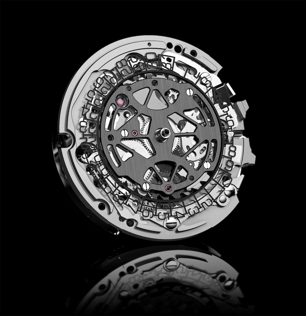 Côté cadran, le design éminemment épuré de cette montre est rehaussé par les commandes du chronographe et le disque ajouré de la date. Côté fond de boîtier, le regard est attiré à l’intérieur du mécanisme par la roue à colonnes rouge, repère visuel audacieux, ainsi que par le pont de chronographe squeletté et la masse oscillante noire.