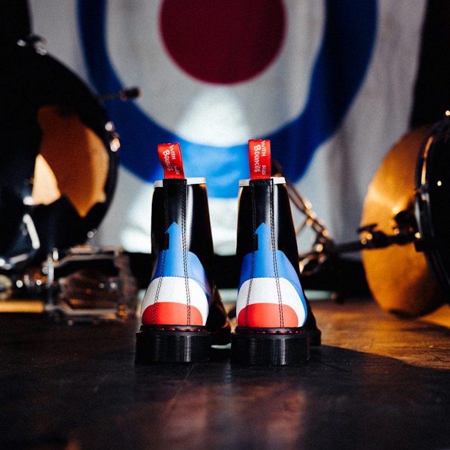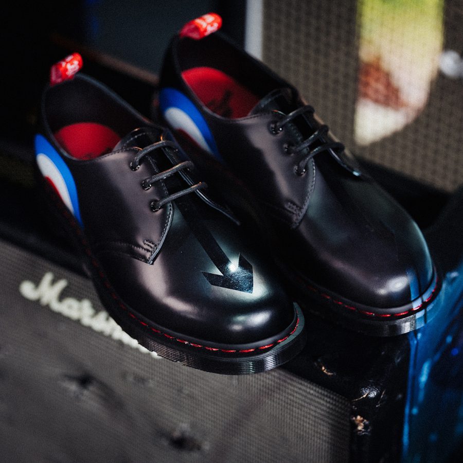 La 8-œillets 1460, la 3-œillets 1461, et le mocassin Adrian en cuir Smooth se parent de l’iconographie The Who, ainsi que des éléments emblématiques de l’ADN Dr. Martens, réinterprétés pour l’occasion : surpiqure et boucle talon deviennent rouge.