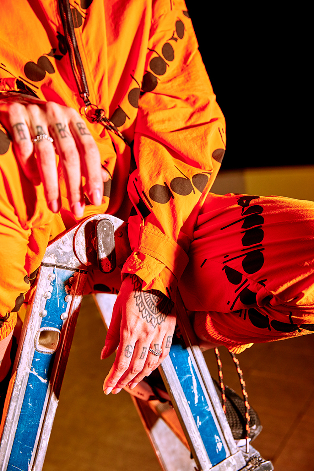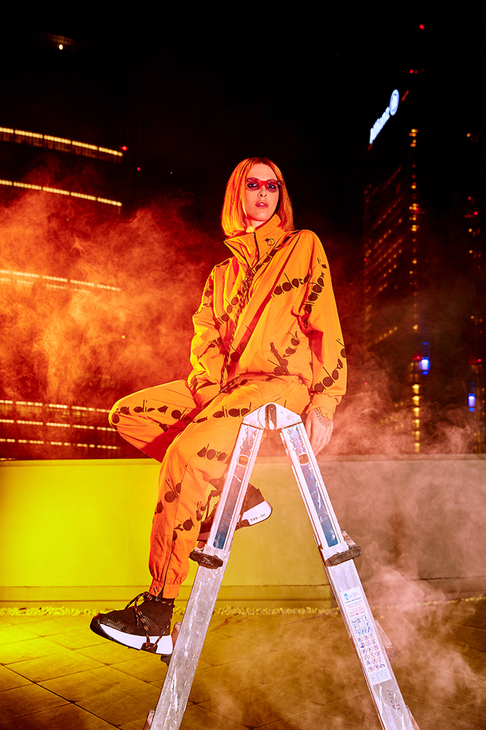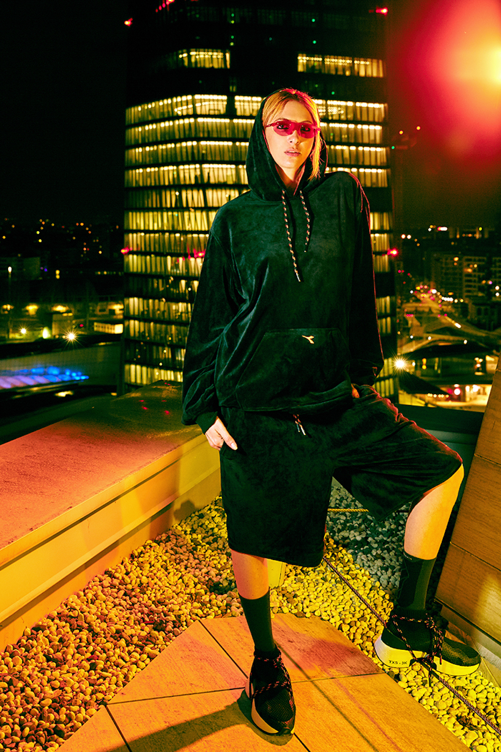 La collection unisexe est composée de deux tenues : la première, un ensemble hoodie et short oversize en polaire noir et la seconde, un survêtement en nylon Taslan imprimé logo Diadora all-over.