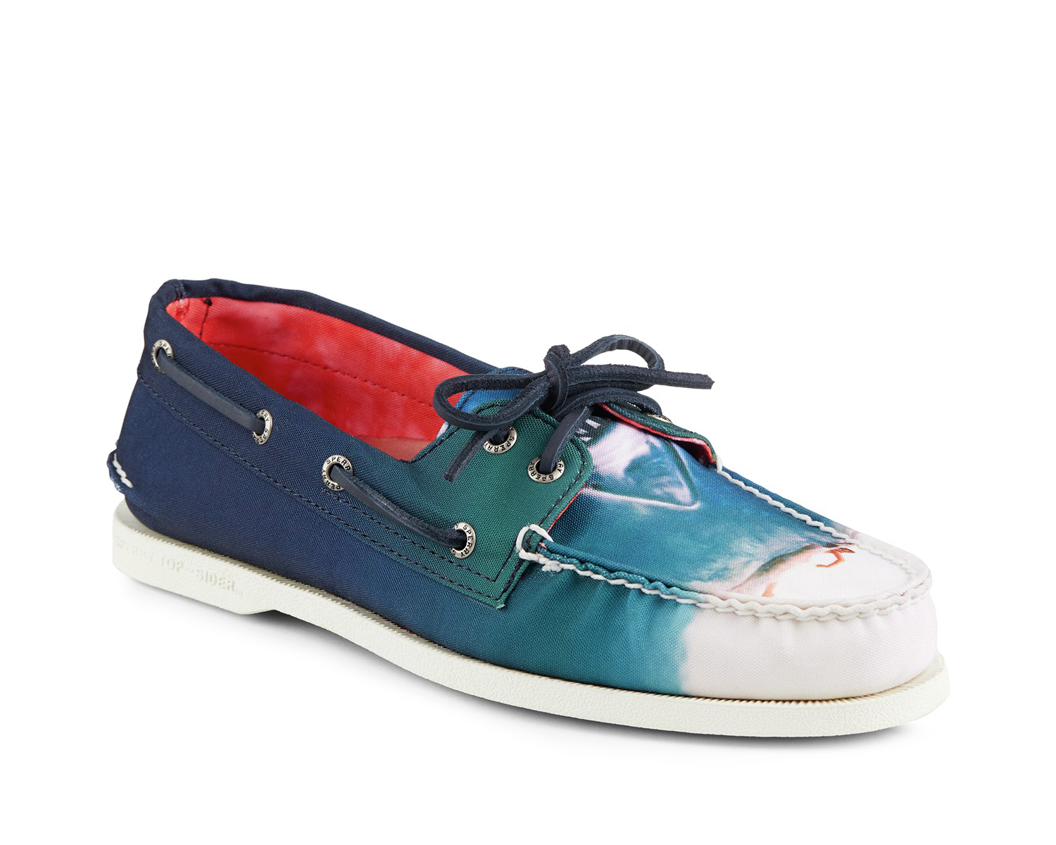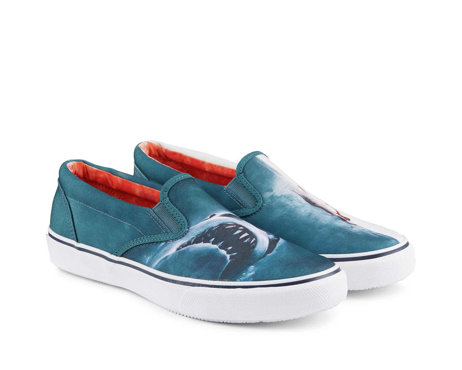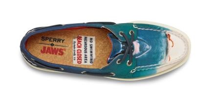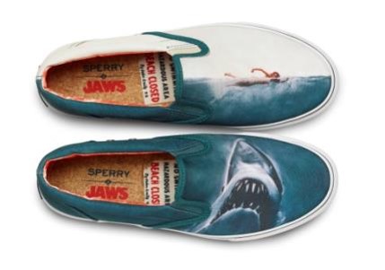Il y a plus de 40 ans Steven Spielberg choquait le grand écran avec le phénomène Jaws ou « Dents de la mer » pour les francophones. La marque au pieds marin, Sherry, n’en a pas été découragé pour autant et réédite aujourd’hui les chaussures portées par les courageux chasseurs de requins de l’Orca avec un imprimé en référence au thriller.