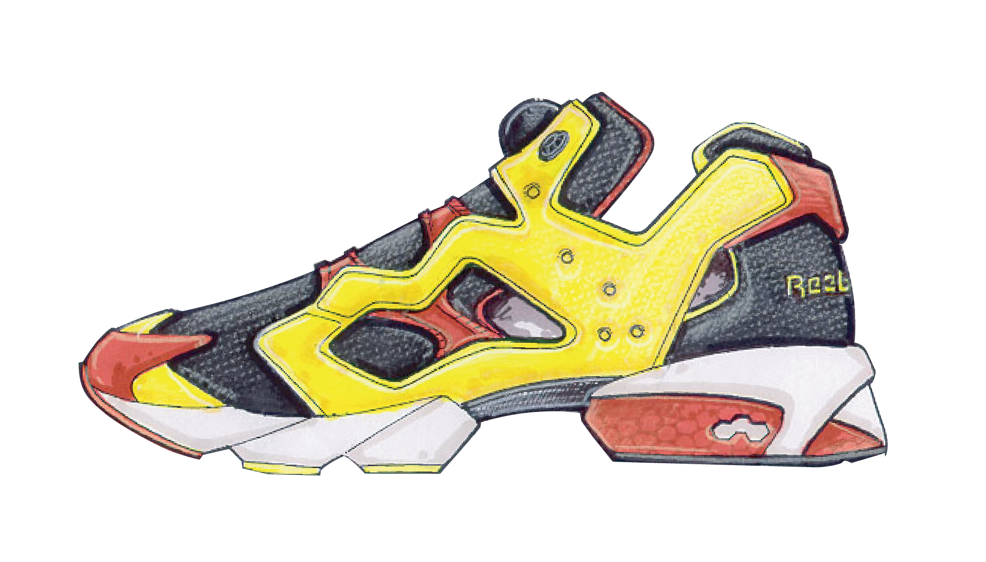 En 92, nous avons eu l’idée de combiner toutes les technologies expérimentales de l’époque en une chaussure concept-car. J’avais déjà esquissé une semelle divisée en deux avec une pièce en carbone faisant office de pont entre l’avant du pied et le talon pour le “ Graphlite carbon arch ”. Peter, qui avait développé Hexalite et Graphlite, était aussi excité que moi. Le père de la Pump, Litchfield, avait l’idée saugrenue de mettre à jour tout le système de vessie, comme un exosquelette. Une autre technologie que l’on voulait intégrer, était le “slide-in hex” – une version verticale de l’Hexalite – on l’a retrouvera plus tard sur les “ Question ” d’Iverson.