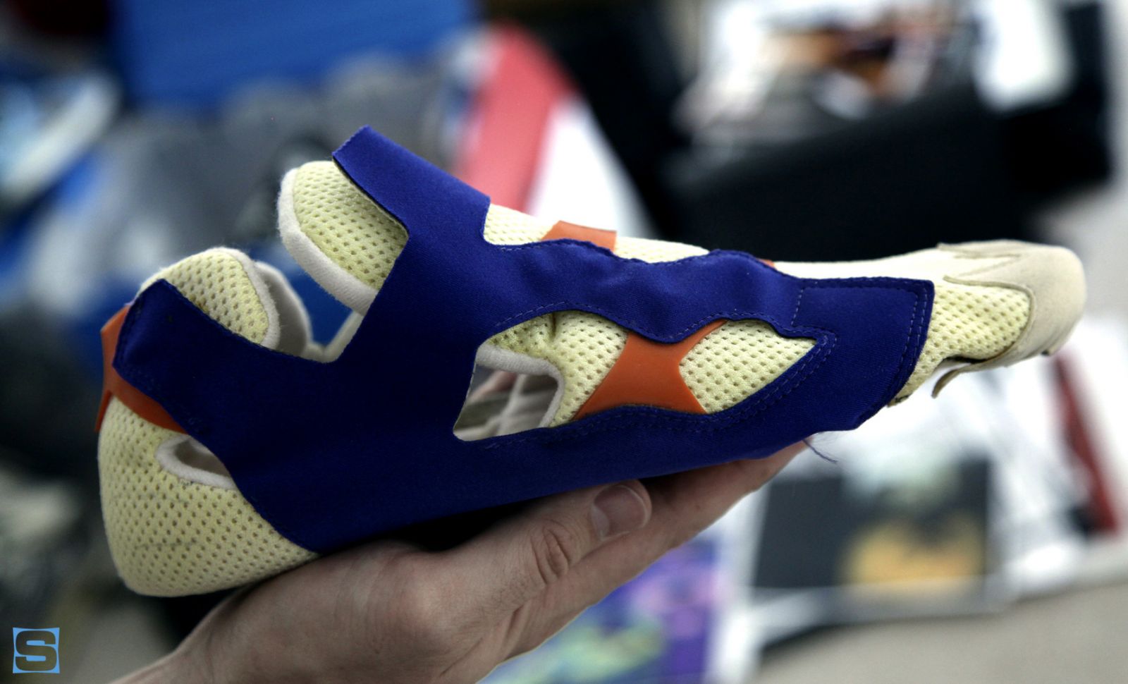 Peter a passé des heures avec des équipementiers de l’aérospatial pour fabriquer l’arc en fibre de carbone. Litchfield et moi nous sommes concentrés sur le système pump externe comme unique système d’ajustement. On travaillait avec des manufactures capables de développer un textile qui s’étirerait pendant le gonflage tout en protégeant l’airbag à l’intérieur. Les premières versions comprimaient le pied, pas très confortables. Lors d’une réunion avec Shawmut Mills, la lumière fut : une matière qui ne s’étirerait que jusqu’à un certain point tandis que la surface intérieure continuerait d’envelopper le pied comme un chausson. 10% d’expansion pour le tissu extérieur, pas plus ! Les premiers échantillons ont été concluants.