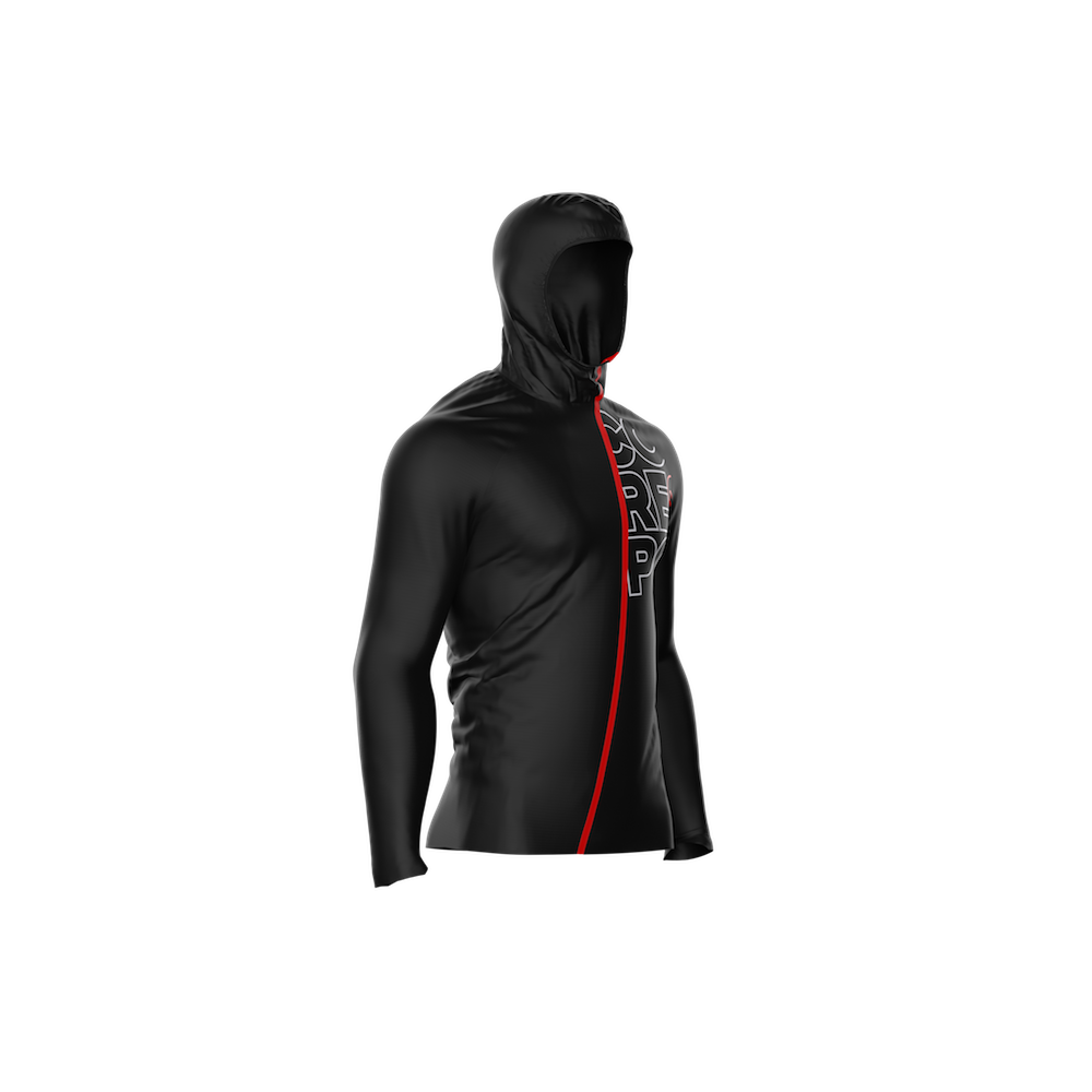 Les conditions météo de ce printemps, nous ont permises d’éprouver à de nombreuses reprises la veste Hurricane. Son look est vraiment top ! Il est à la fois minimaliste, épuré et technique. Sa couleur noire et sa fermeture éclaire rouge lui donne un ton résolument moderne et urbain. « Compressport » est imprimé en gros caractères sur la poitrine gauche de la veste, de quoi renforcer l’identification et le sentiment d’appartenance à la communauté des « ultras ». Le look est clairement réussi, et nous savons que c’est important pour les runneurs urbains que nous sommes ; mais au-delà, il s’agit bel et bien d’une excellente veste technique de course à pieds. Son poids est tout juste incroyable, à peine 105 grammes ! La Hurricane est tellement légère qu’elle donne l’impression de ne rien porter. Sa coupe est bien ajustée et les fibres sont extensibles afin de s’adapter à toutes les morphologies, tout en restant aérodynamique pour affronter les éléments. La capuche et le col sont ergonomiques, s’adaptent au plus près du corps et évitent que le vent ne s’engouffre, ne ralentisse ou nous refroidisse pendant l’effort.