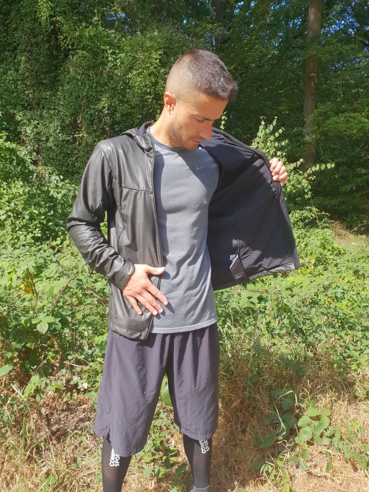 Premier constat, elle est extrêmement légère et très douce au toucher. On note une absence de couture sur les cotés et les épaules afin d’améliorer la mobilité. Un cordon de serrage de la taille est accessible par les deux poches extérieures. Les inserts aux poignets sont stretchs, les différents logos réfléchissants et la capuche intégrée est élastique mais non réglable. Les poches frontales sont grandes et permettent d’y loger pas mal de petits objets, comme clés, téléphone portable, gants ou bonnet. Un passage de casque audio filaire est même prévu dans la poche droite.